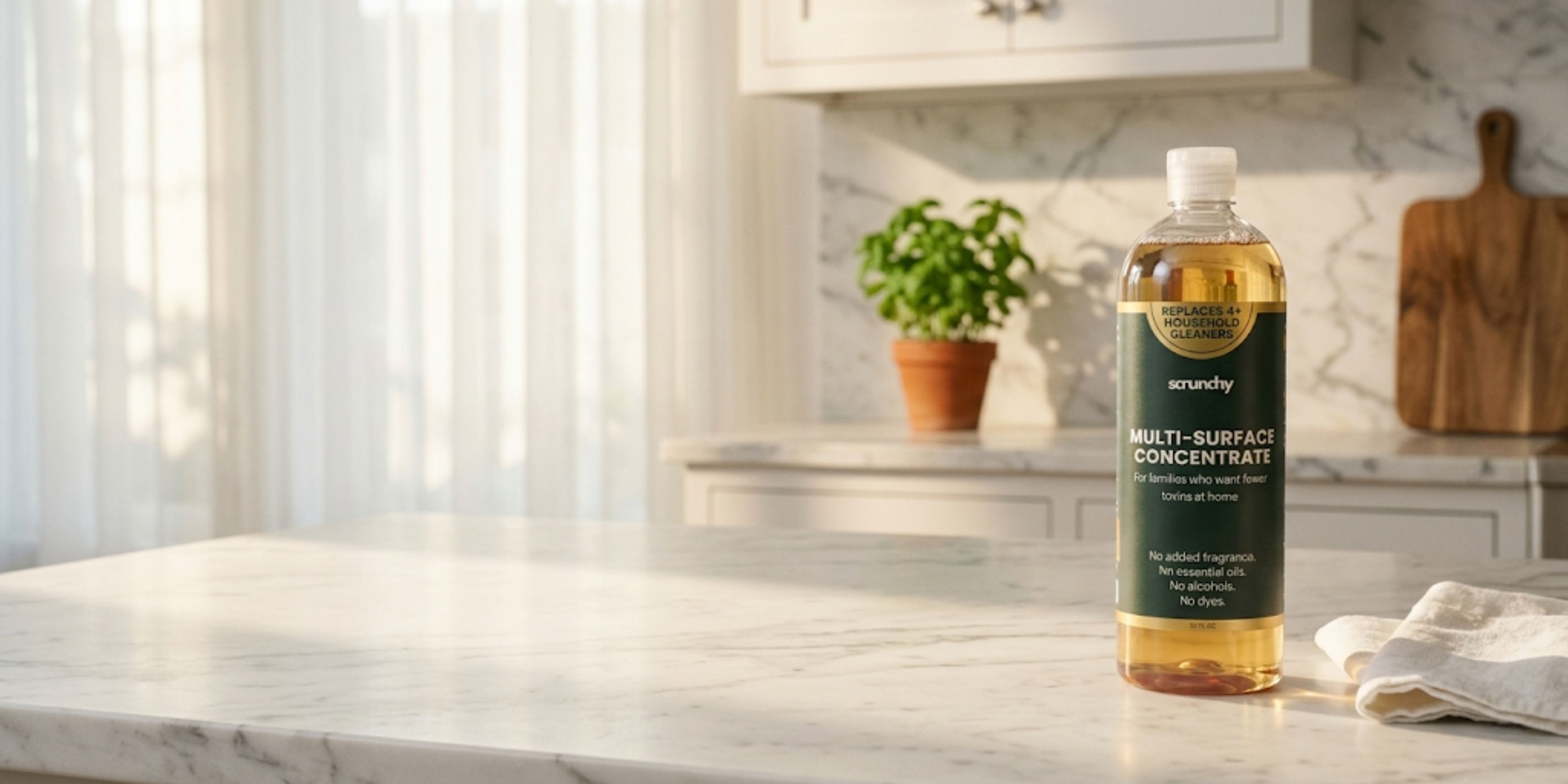 A cleaning concentrate is a highly concentrated formula you dilute with water at home to make your own spray bottles. Scrunchy's 32oz concentrate makes up to 24 all-purpose (16 oz) spray bottles, replacing the need to buy individual cleaners for different surfaces. You add a measured amount of concentrate to a reusable bottle, fill the rest with water, and you have a fresh, non-toxic cleaner ready to use.